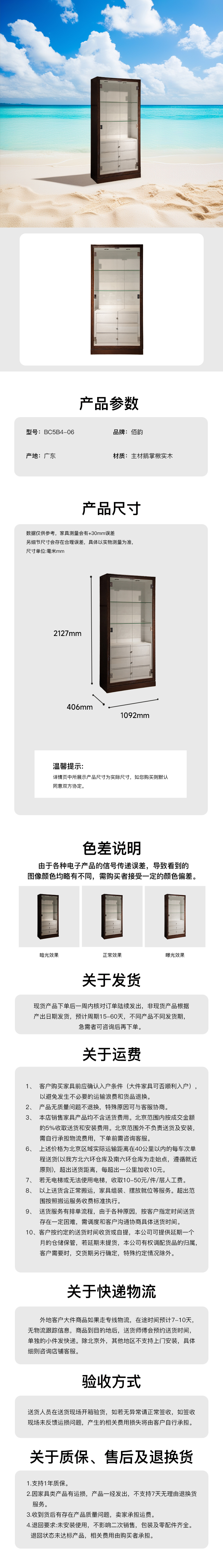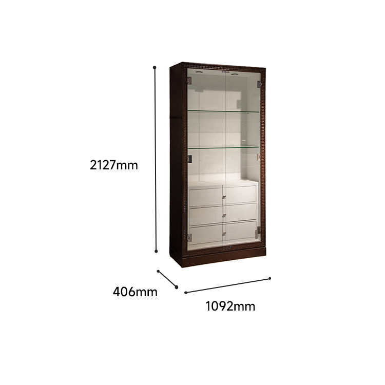 主材:*主材鹅掌楸实木 *MDF环保板(P2级美国出口标准) *环保夹板抽屉(P2级美国出口标准) *8mm钢化玻璃层板和钢化玻璃门 *配置重型玻璃合页 *配置2套防倾倒五金装置